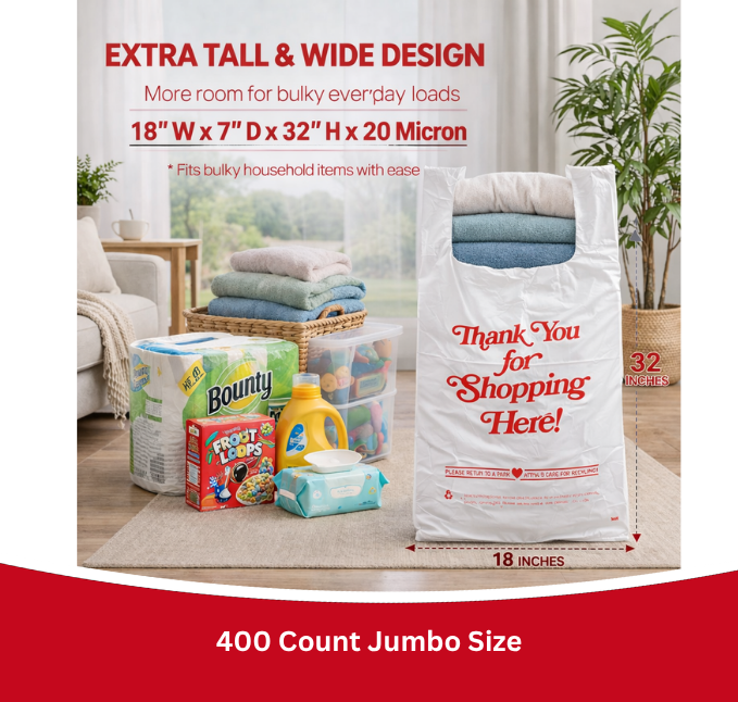 Each bag is crafted with 20-micron thick plastic, providing excellent durability to handle heavy groceries, bulk items, and takeout orders without tearing. The jumbo size (32″ x 7″ x 18″) offers ample space, making it ideal for large and bulky items.