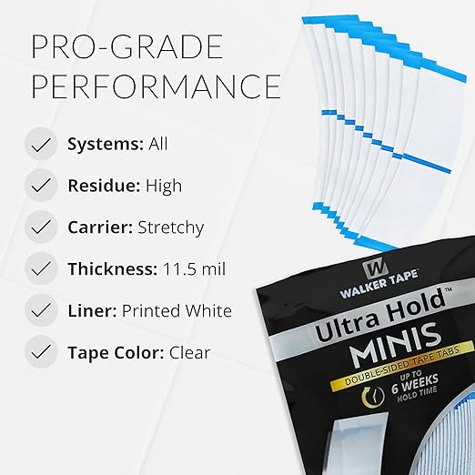 Walker Tape Ultra Hold Mini Tabs (72 Tabs) are one of the most trusted adhesive solutions for securing hair systems, lace wigs, and extensions. Designed with advanced adhesive technology, these double-sided tabs offer a powerful hold that keeps your hairpiece firmly in place for days or even weeks.